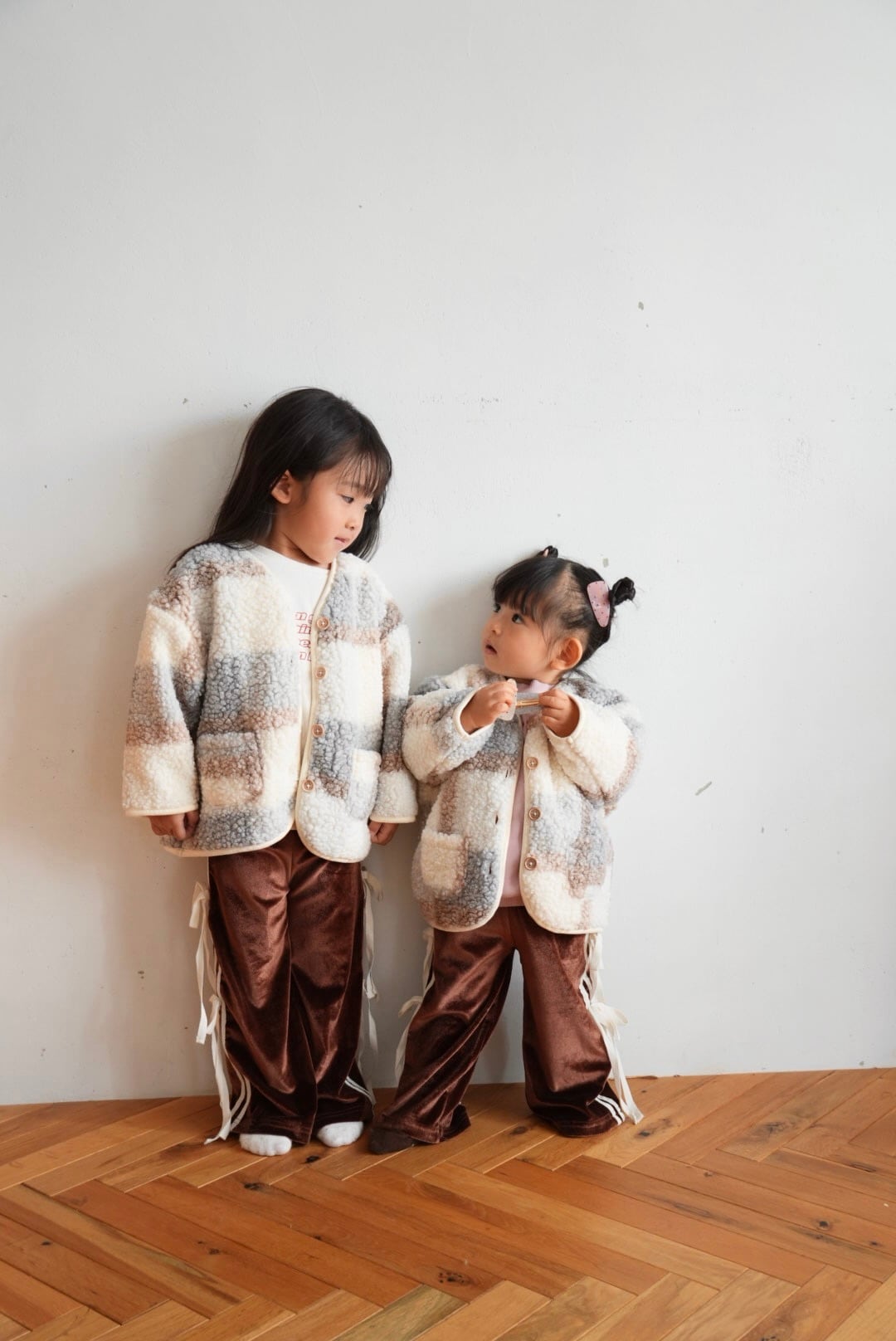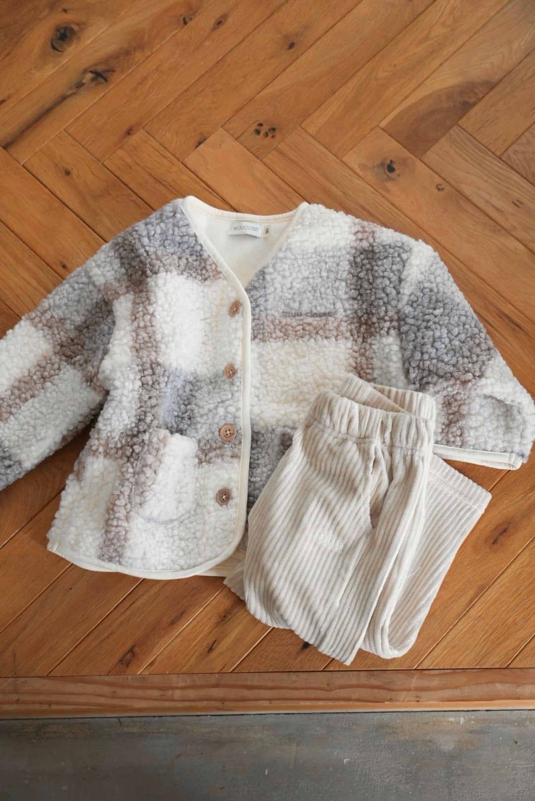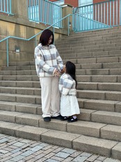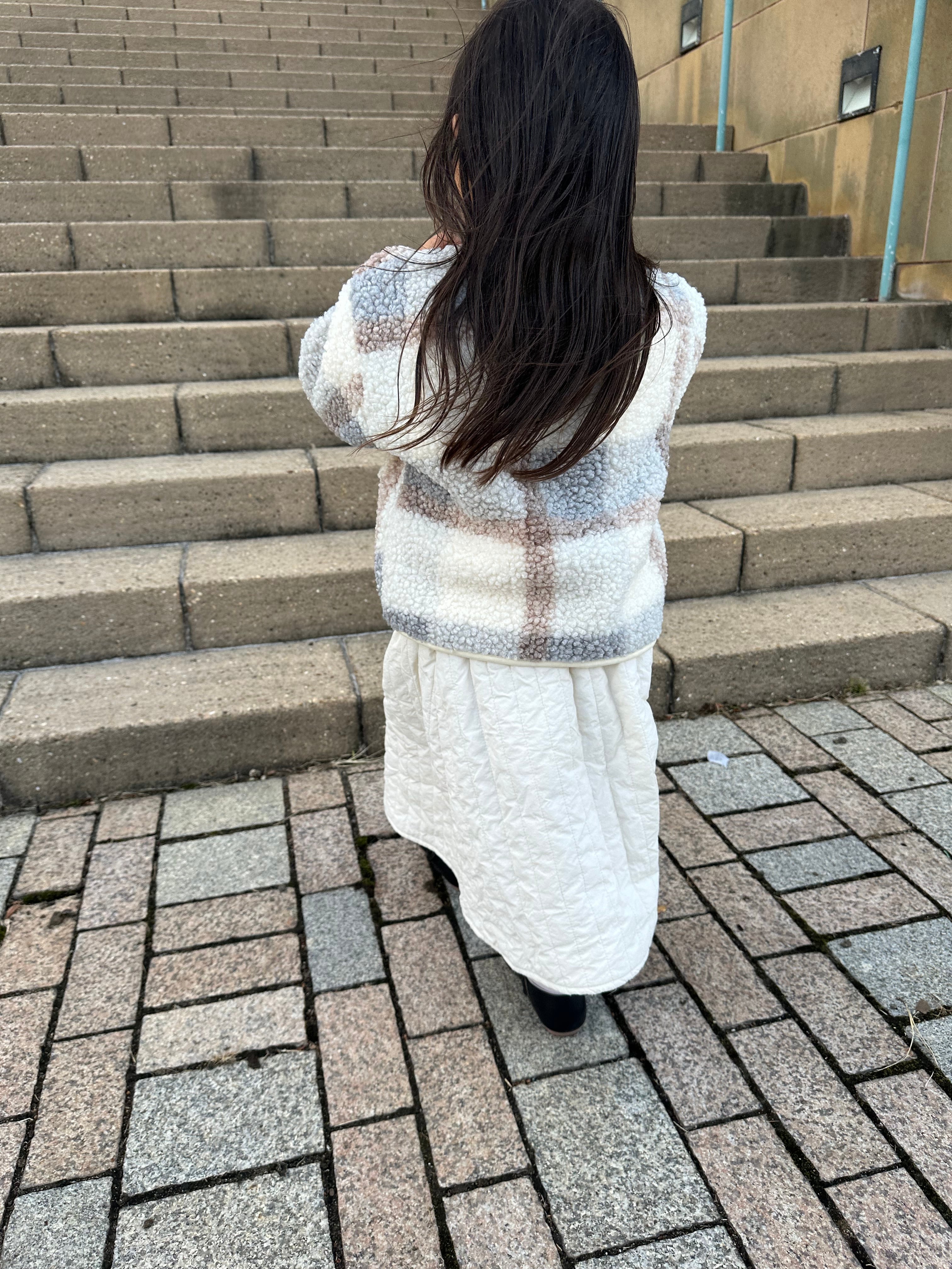 柔らかい配色のチェック柄のボアジャケット♡
